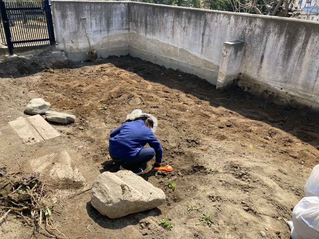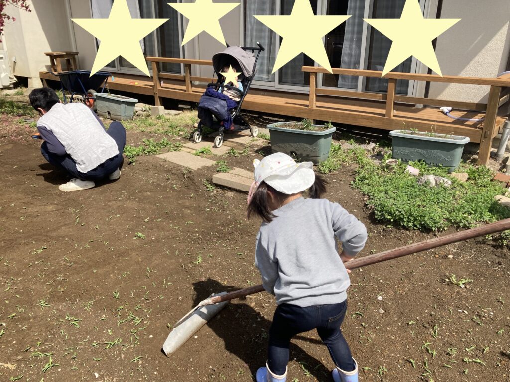 一緒に、土を掘ったり、石を取ったり、お水をあげたり。
