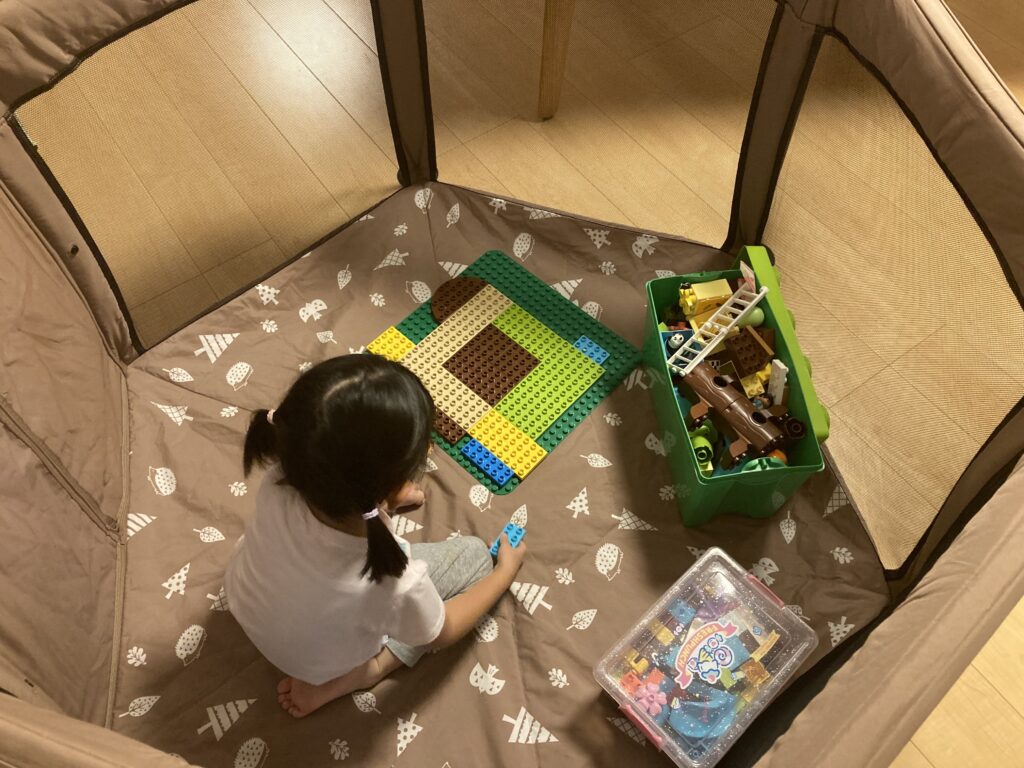 上の子の好きなシルバニアファミリーやレゴブロックで、下の子を見ながら同じ空間で遊べていました。