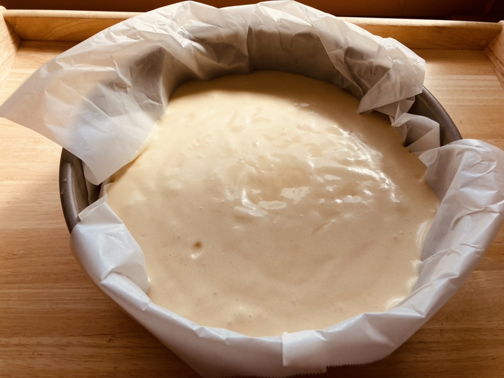 流し込んだ後に、10センチくらいの高さから型ごとトンと1〜2回落として、大きな気泡を抜きます。