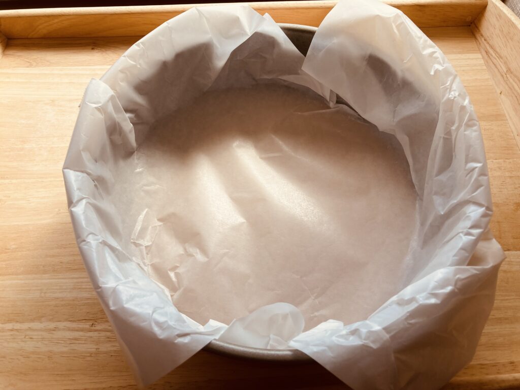 デコレーションするショートケーキなどは、綺麗な側面になるように、クッキングシートも綺麗に切って敷きますが、今回のはちみつケーキは焼き上がったらそのまま食べてしまうので、見た目を気にせず豪快にクッキングシートを敷いても大丈夫です。意外と型にクッキングシートを綺麗に敷く作業って手間ですが、くしゃっと入れてしまうと一瞬で出来て楽です。それだけでお菓子作りのハードルが下がって、作ろうと思った時にすぐ作り始めることができます。