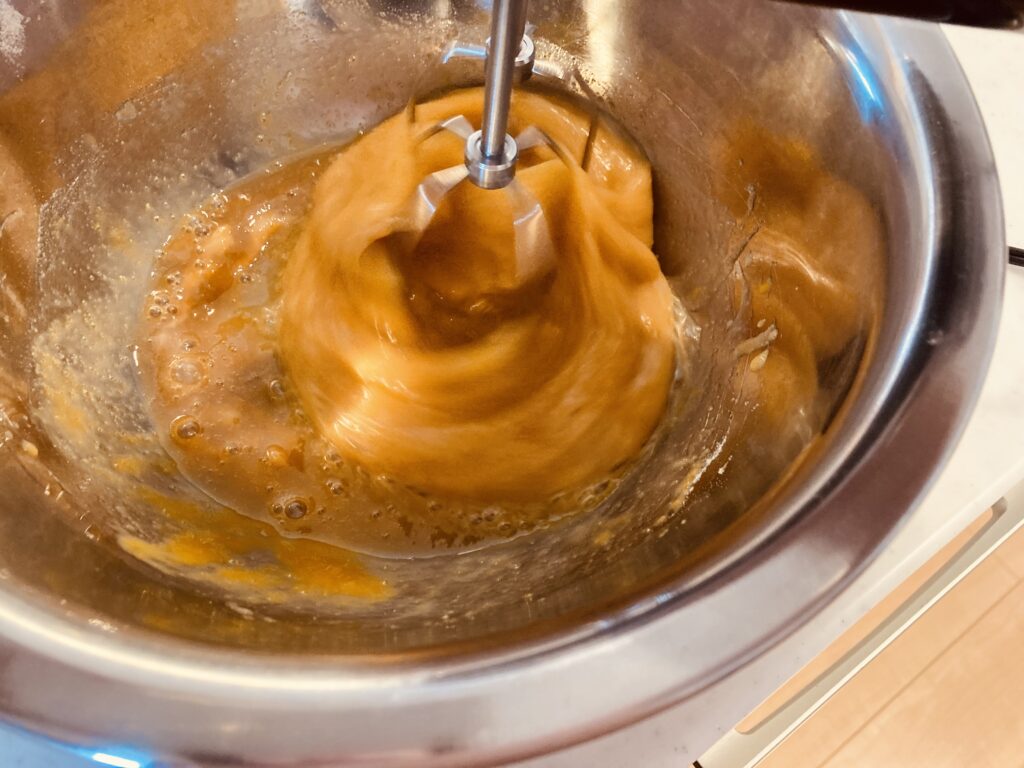 1. ボウルに卵ときび砂糖を入れて、電動泡立て器で混ぜる。(10分くらい)