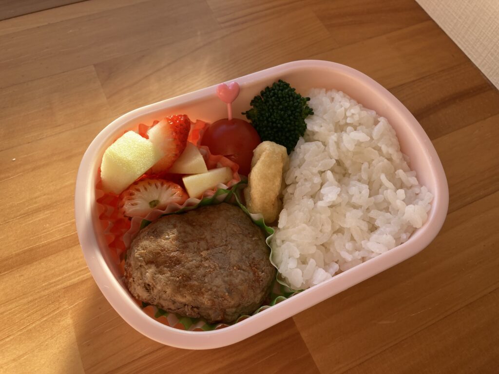 献立:白米、ハンバーグ、アンパンマンポテト、ミニトマト、ブロッコリー、果物